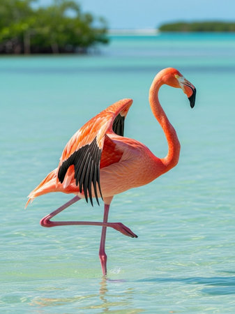 A stunning flamingo gracefully stands in crystal-clear turquoise waters, reflecting tranquility under a bright sky, embodying tropical beauty and serenity.