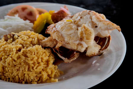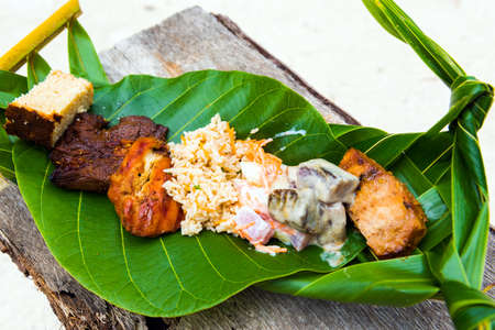Fried meat with rice on a banana leaf, Bora Bora, French Polynesia. Close-up
