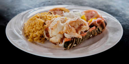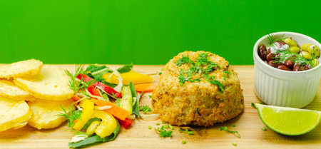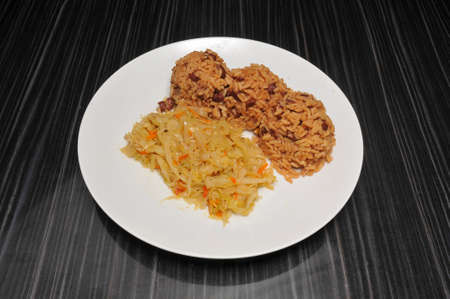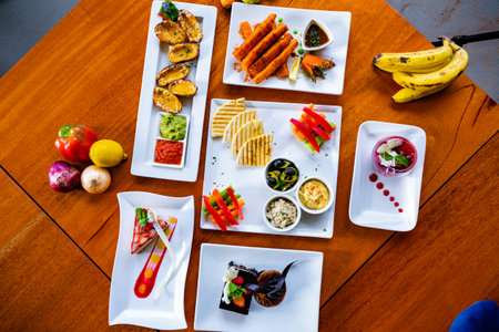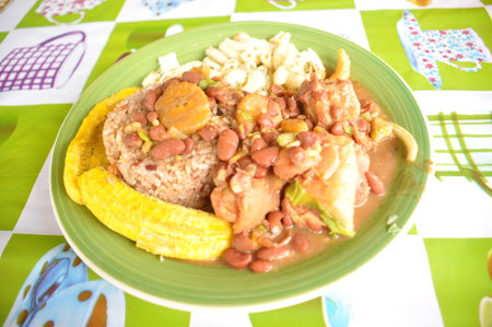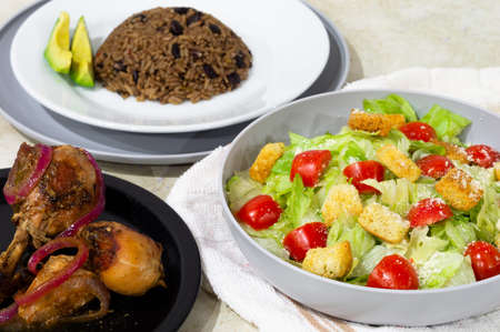 Caribbean cuisine, Traditional assorted dishes, Top view.