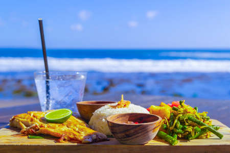 Thai fried rice with prawns served in bowl on beach table. Seaside dining at the ocean. Concept of tropical cuisine, romantic dinner, Asian cuisine, Thai traditional dish, culinary.