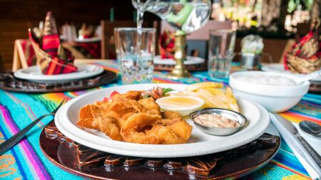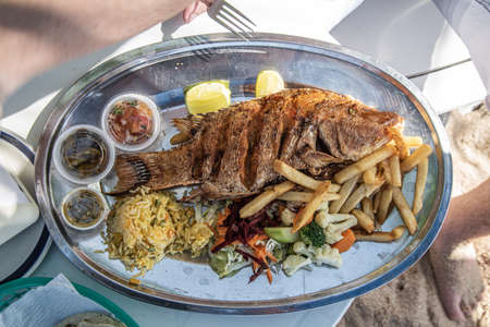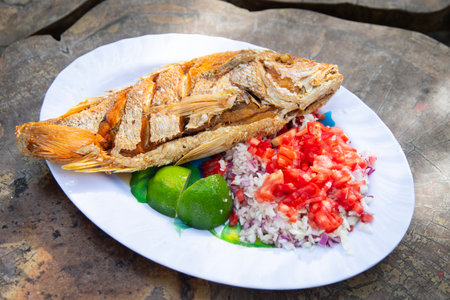 El Cuyo, Mexico; November 1, 2025: Fried fish at a restaurant in El Cuyo, a fishing village on Mexico's Yucatan Peninsula.