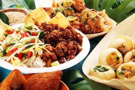 various street food with pani puri, chicken wings and coxinha on rustic background. balinese nasi campur and indian and brasilian street food