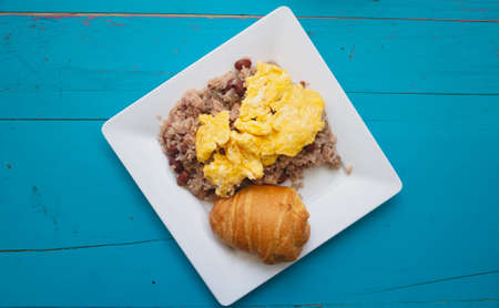 Typical colombian breakfast over table, Traditional Colombian breakfast, Calentado with egg and bread