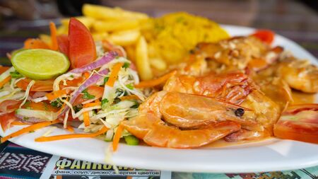 Large plate with a mix of grilled seafood shrimp, octopus, tuna fish, squid. BBQ exotic food on the beach.