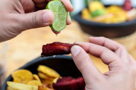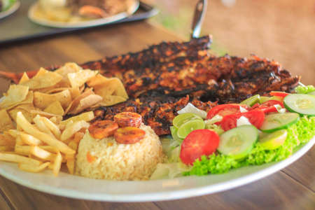 Typical food for Panama, banana slices, chicken, rice and vegetables, street sale served on a plastic plate, wooden background, very tasty food.