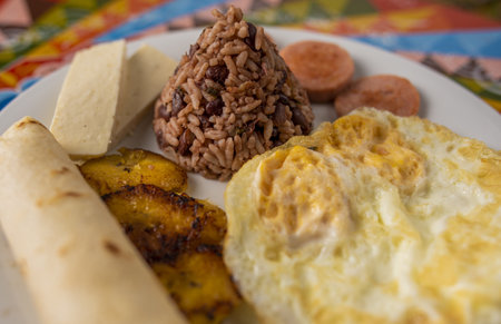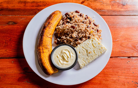 Gallopinto plate with cheese and maduro on wooden table. Nicaraguan food concept, Traditional Gallo Pinto meal with maduro and cheese served