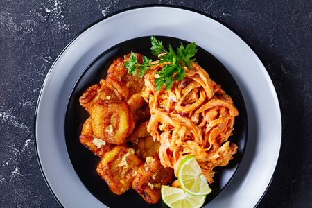 Twice fried plantains caribbean finger food served with shredded chicken with ketchup and mayonnaise sauce on a black plate, top view, close-up