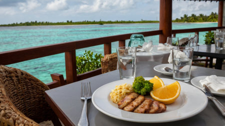 Vacation breakfast table at luxury restaurant or hotel room panoramic banner. Romantic cruise honeymoon travel holiday in Maldives or Tahiti