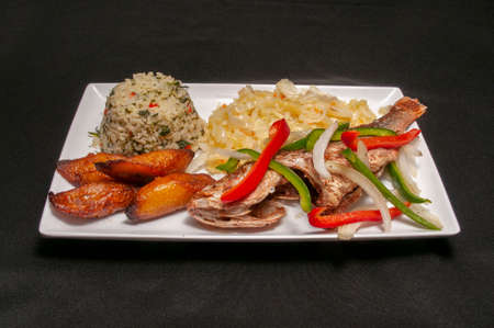 Traditional roast beef with slices of banana and gallopinto served on a wooden table. Wooden table with traditional roast meats and gallopinto