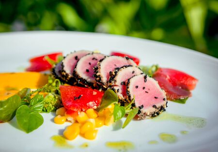 Meat fried in sesame roll with vegetables on a white plate. The Restaurant