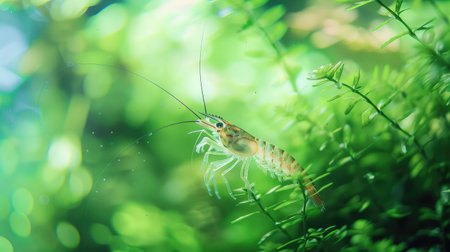 Colorful Shrimp Swim Gracefully in a Vibrant Underwater Habitat Filled With Lush Vegetation and Clear Water. Generative AI