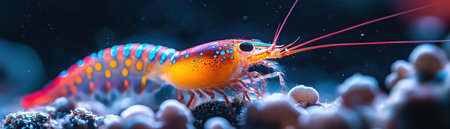 Brightly colored shrimp in an underwater environment, macro shot, soft lighting, for a vibrant and detailed marine scene