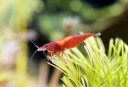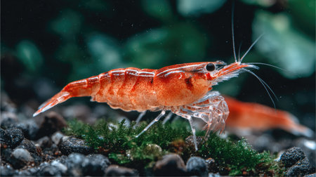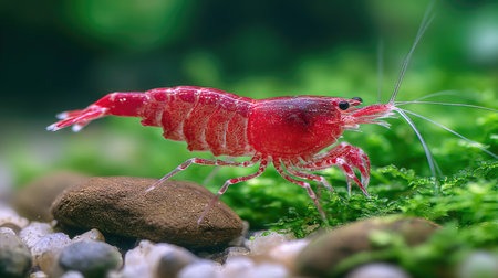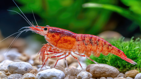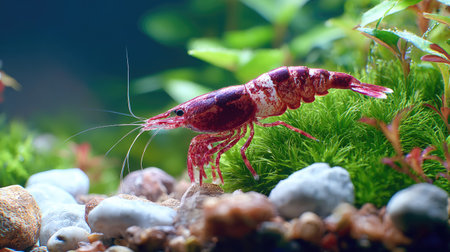 A close-up photograph showcases a red shrimp, highlighting intricate details of its body structure. The image reveals aquatic life on a bed of pebbles, with lush green plants forming the background. Suitable for various editorial and commercial applications, the photograph captures the essence of underwater environments.