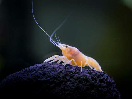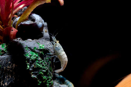 White orchid sulawesi dwarf shrimp look for food in volcanic rock or aquatic stone of fresh water aquarium tank with the decoration as background.