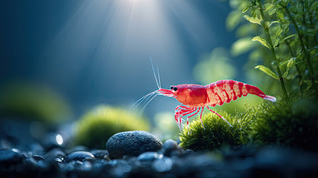 A vibrant image presents a Red Cherry Shrimp within an aquatic habitat. The shrimp, characterized by its reddish hue, is positioned amidst a collection of aquatic plants and rocks. The composition displays a balance of colors and textures, capturing the essence of underwater life. Suitable for illustrative or educational applications.