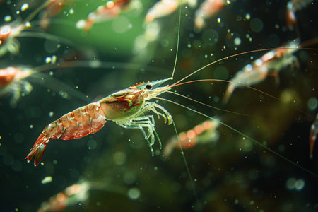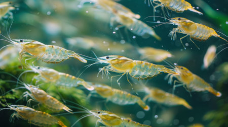 Underwater View of Shrimp Swimming Gracefully in a Vibrant Aquarium During Daylight Hours, Showcasing Their Natural Behavior and Habitat. Generative AI