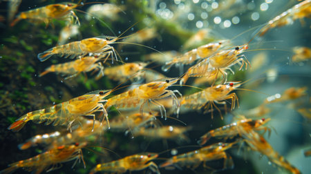 Group of Orange Shrimps Swimming Gracefully in Aquarium Filled With Aquatic Plants and Clear Water During Bright Daylight Hours. Generative AI