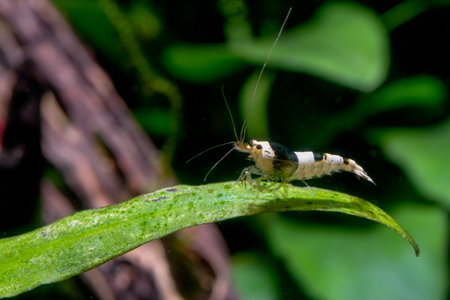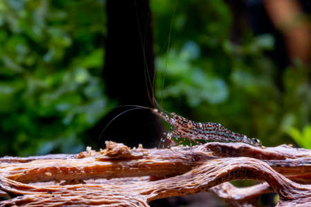 Crystal fancy white tiger dwarf shrimp stay alone on timber with green aquatic plant as background in fresh water aquarium tank.