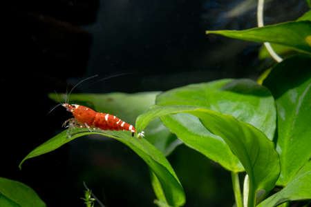 Red galaxy dwarf shrimp stay on green leaf aquatic plant and look over in fresh water aquarium tank.