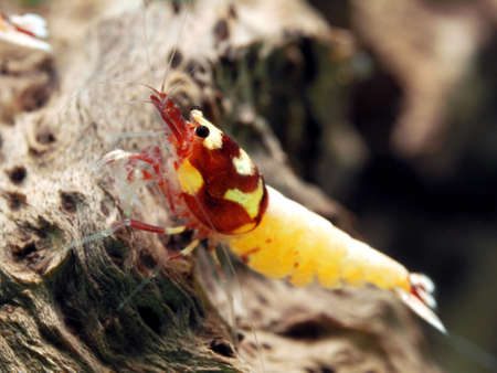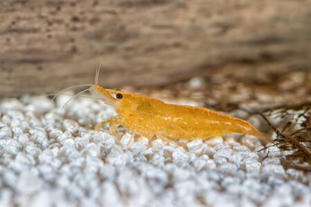 Yellow freshwater shrimp closeup shot in aquarium (genus Neocaridina)