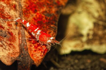 White spot sulawesi shrimp or cardinal shrimp with long antenna stay alone on green leaf of aquatic plants. Conspicuous features of the cardinal shrimp is its white front legs.