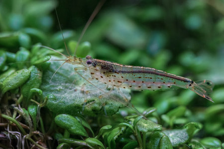 Macro shot of Freshwater Amano shrimp eating. Caridina multidentata.