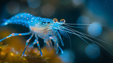 A macro shot of a stunning blue shrimp with intricate patterns and long antennae, captured in its underwater habitat.