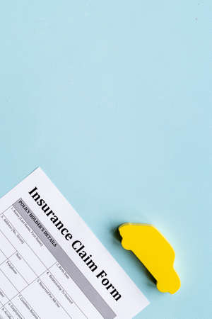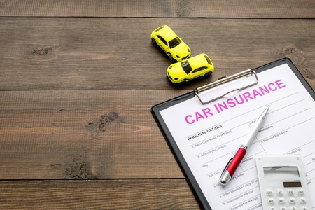 Car insurance concept with form, car toy and calculator on wooden desk background