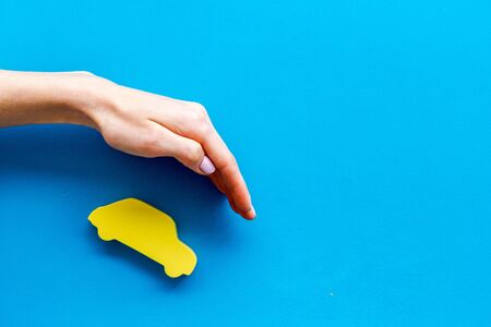Car insurance. Hand defends automobile cutout on blue background top-down copy space