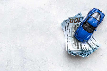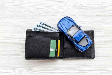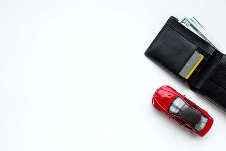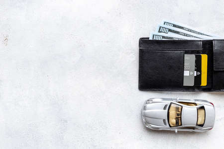Purchase or rent a car concept. Toy car with wallet and money cash