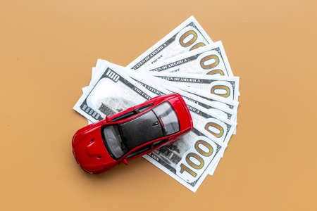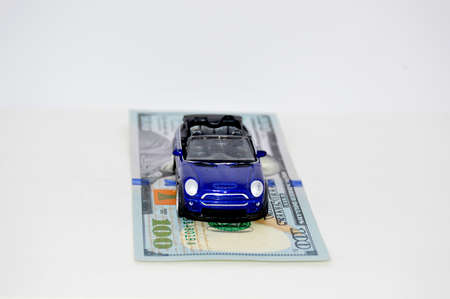 Toy car on the background of a lot of dollar bills. The concept of buying a car.