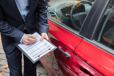 Insurance Agent Writing On Clipboard While Examining Car After Accident