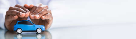 Close-up Of A Man's Hand Protecting The Miniature Blue Car On Reflective White Desk