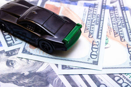 Black toy car on a heap of dollar bills on a white and black background. A sports car with a green spoiler, a wing on dollars in a close-up top and side view. Rear and front car. Selling, buying