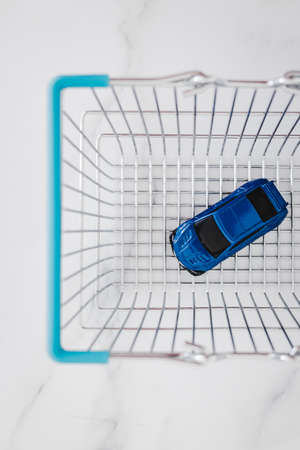 toy car inside of shopping basket over white marble background, concept of buying a new car