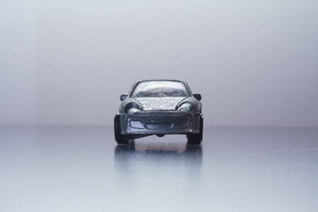 Children's toys cars display accident on the road blue car overturned lying on the roof