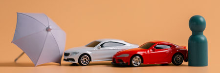 Businessman hand holding umbrella and cover red car toy on table. Car insurance, warranty, repair, Financial, banking and money concept