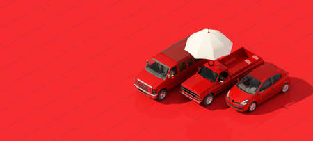 Car protection and safety assurance concept, modern red automobile sedan truck van under white umbrella, isolated on red background, 3d illustration rendering isometric