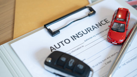 Car insurance contract with red miniature car pen and key symbolizing safe driving accident protection legal coverage financial stability customer trust and family security