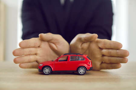 Human hands protecting small red toy car. Close up of little automobile model on table and hands of businessman protecting it. Car insurance, auto safety, warranty, protection concepts