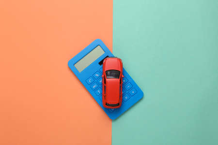Toy car model with a calculator on pink, blue background. Cost calculation, car purchases, fuel consumption, car service costs. top view