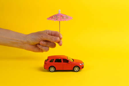 Auto protection concept, insurance. Hand holds umbrella over toy car model on yellow background