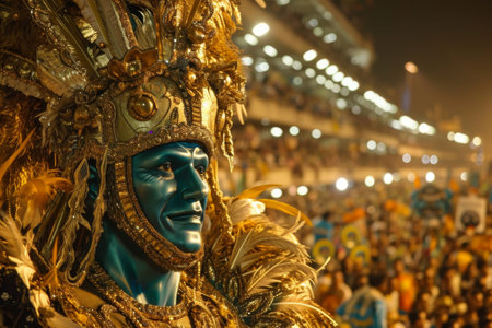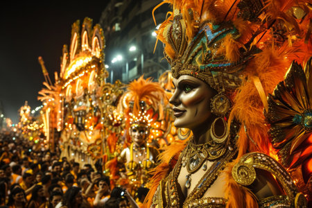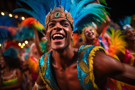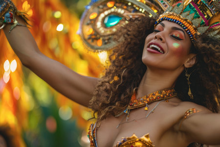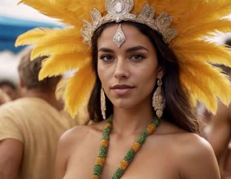 Joyous female dancer celebrates with a bright feather headdress and costume at a night carnival parade