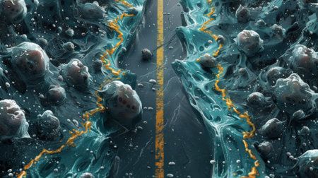 A contaminated by infection road with a yellow line painted on it in the middle of some water, AI