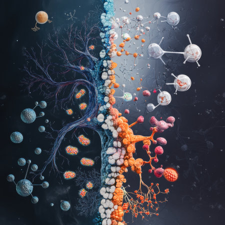 Dynamic visualization illustrates the intricate relationship between various molecules and cells, merging organic shapes with inorganic structures against a contrasting backdrop.