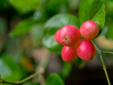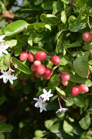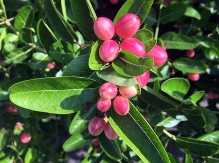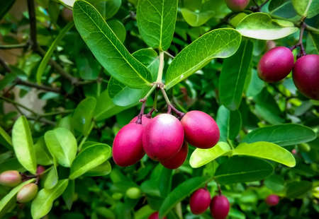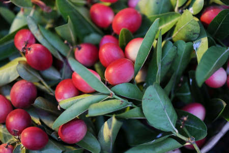 Bunch of fresh red carissa carandas growing in the garden close up