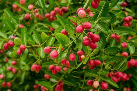Fresh Bengal Currant or Christ's Thorn on tree in garden . it's high vitamin and medicinal properties