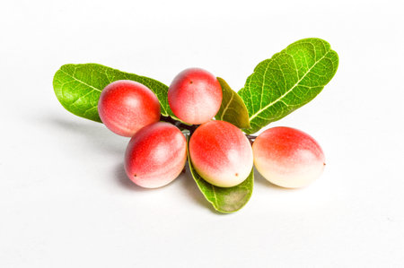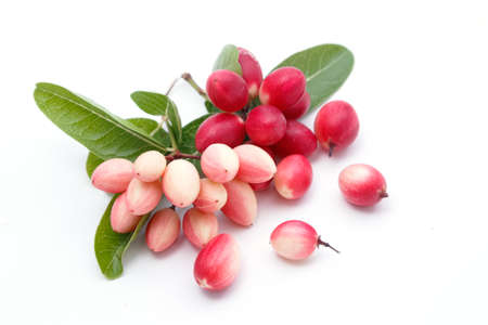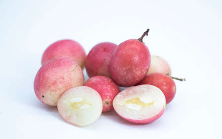 Close up of raw pink karunda fruits on white background.