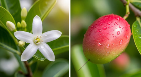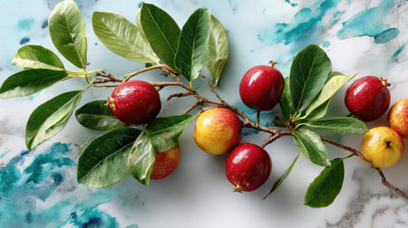 A stunning display of red and yellow fruits on a branch with lush green leaves, set against a vibrant abstract background, perfect for food-themed designs.