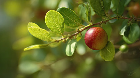 A detailed photograph of a single Camu camu, swaying gently in the wind, captured in natural daylight. Fresh and airy atmosphere, soft motion blur on leaves, crisp details on textures, background softly blurred into natural greenery, cinematic natural light, realistic photography.